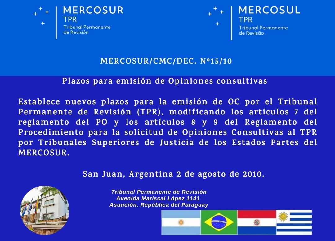 Prazos para emissão de Opiniões Consultivas A CMC/DEC Nº15/10 estabelece os prazos para a emissão de opiniões consultivas pelo Tribunal Permanente de Revisão, modificando o artigo 7º do regulamento do Protocolo de Olivos, e os artigos 8º e 9º do regulamento do procedimento de solicitação de Opiniões Consultivas ao TPR pelos Tribunais Superiores de Justiça dos Estados Partes do Mercosul. San Juan, Argentina, 2 de agosto de 2010.