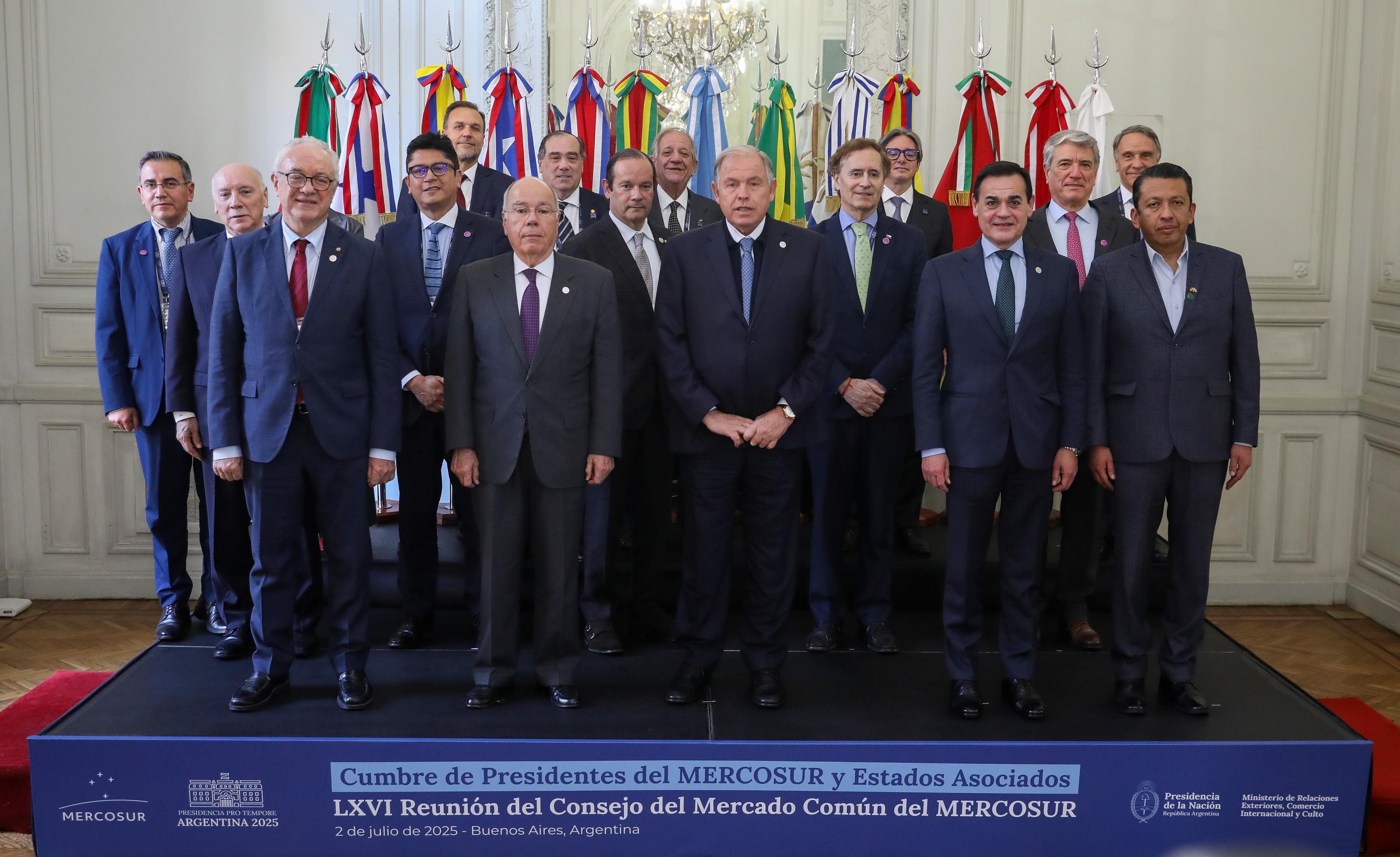 O presidente do TPR, embaixador Eladio Loizaga, na 66ª Reunião do Conselho do Mercado Comum do Mercosul, em Buenos Aires, junto com chanceleres presentes. 02/Jul/2025. |